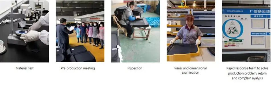 Kami mematuhi sepenuhnya ISO9001 untuk reka bentuk dan pembuatan tikar kereta, ISO/TSI16949 untuk Kawalan Kualiti, ISO14001: 2015 untuk Pengurusan Alam Sekitar, BSCI untuk Tanggungjawab Sosial, dan Piawaian EU mencapai standard untuk bahan mentah. Kami mempunyai kemudahan ujian dalaman untuk melakukan pemeriksaan sendiri untuk memastikan ujian produk kami meluluskan ujian yang dilakukan oleh SGS, Intertek, atau mana-mana pemeriksa pihak ke-3 yang lain yang diperlukan oleh pelanggan.
