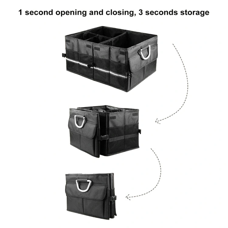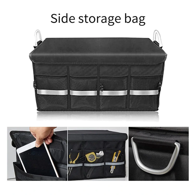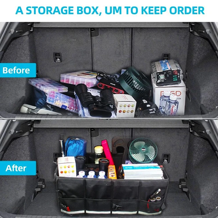 Tiga petak utama menganjurkan alat, makanan, peralatan sukan, pembersih, dan barangan kecemasan. Empat poket sisi mesh memegang barangan kecil seperti tuala atau kad. Poket yang bertingkat depan menjamin kemungkinan dan berakhir. Ia sesuai dengan trak, sedan, SUV, van, dan cukup banyak kenderaan.