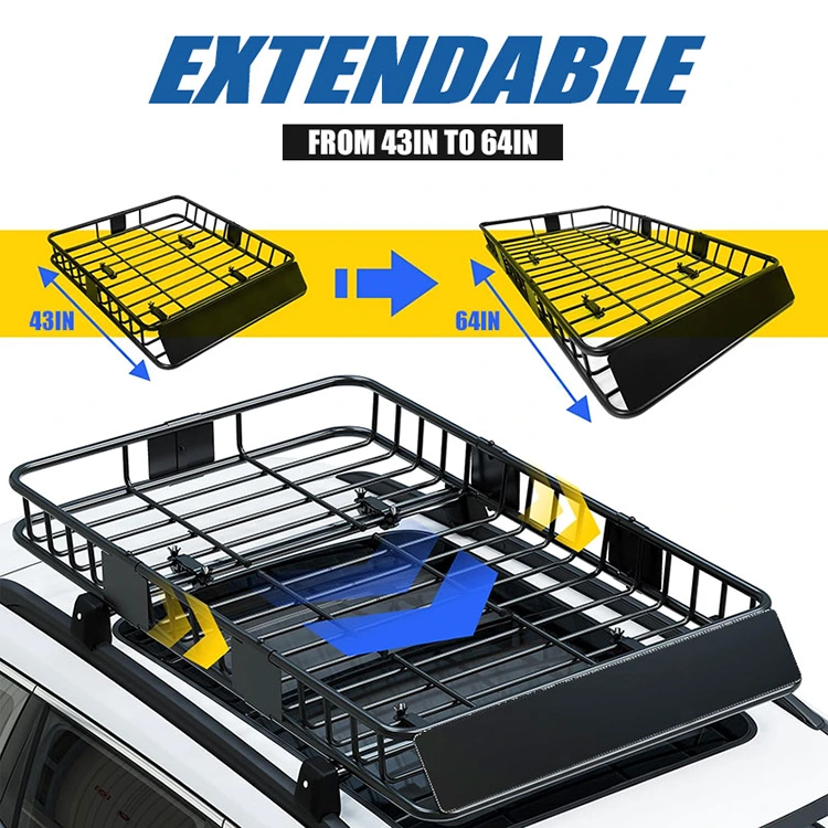 Reka bentuk yang boleh dilanjutkan: Basket pembawa rak bumbung ini mempunyai saiz standard reka bentuk yang boleh dilanjutkan (43 "x 39" x 6 ") untuk kereta padat dan diperkembangkan sehingga 64" untuk kenderaan yang lebih besar, memaksimumkan ruang kargo. Bentuknya yang dilipat menjadikannya mudah dibongkar, pengangkutan, dan menyimpan apabila tidak digunakan. Ia sesuai untuk keperluan perjalanan dan penyimpanan yang fleksibel.